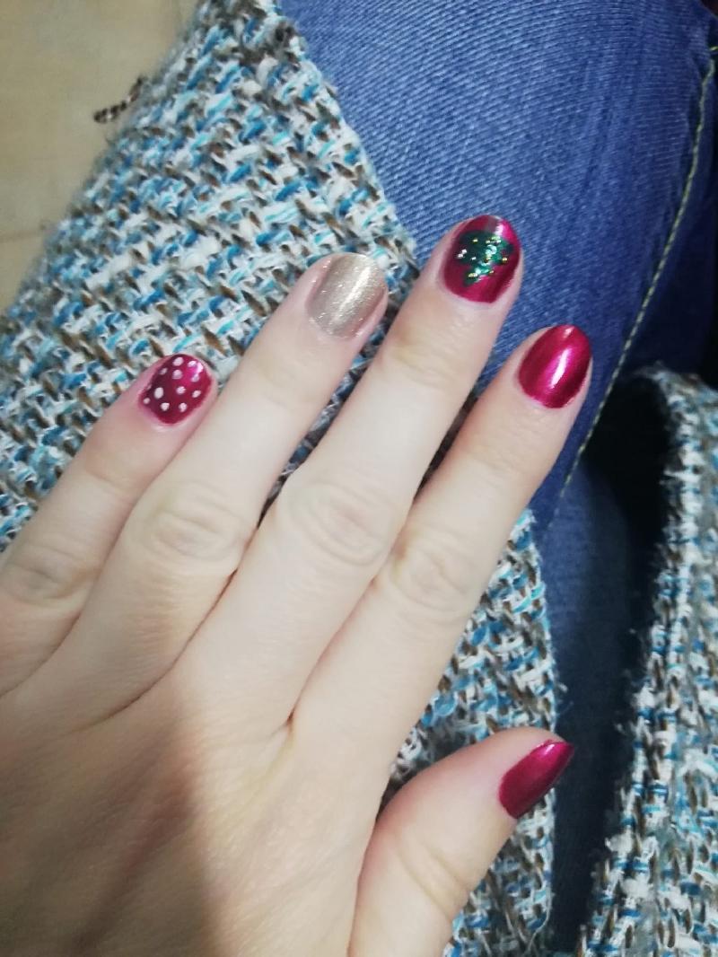 La tercera se la hice a mi hermana, ella la quería caracterizada total con motivos de árboles de Navidad y cosas así, y eligió el mismo color granate de las anteriores para todas las uñas menos para la anular. Como detalles, en ambas uñas meñique le hice unos puntitos blancos a modo de copos de nieve, la anular, iba de color plateado brillante y tan sólo una uña más iba decorada, en éste caso con un abeto verde con pequeñas bolitas de caviar para uñas de colores a modo de bolas del árbol.