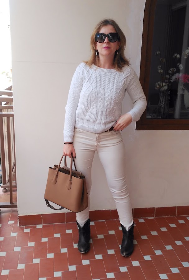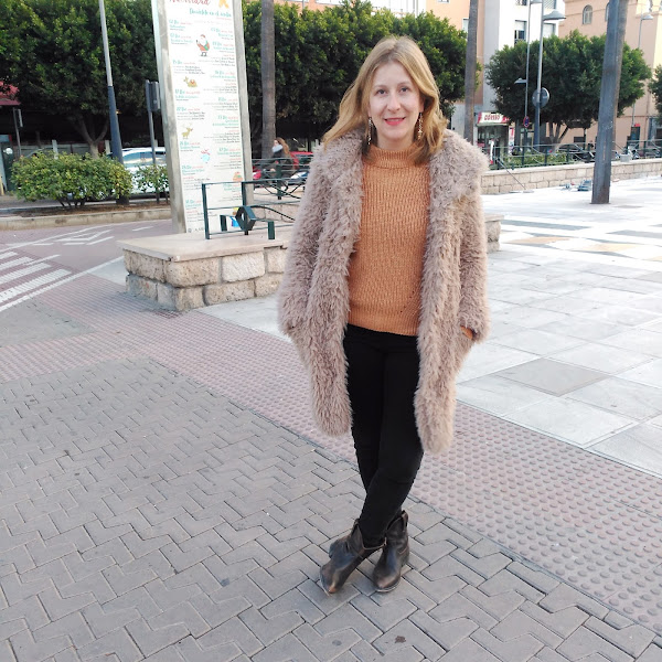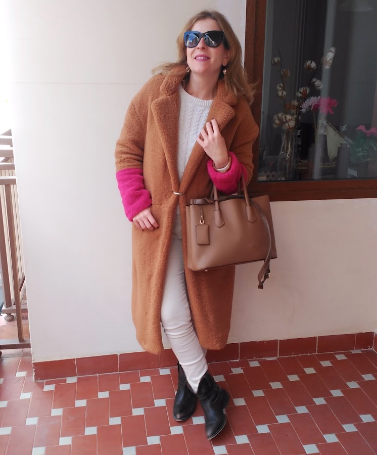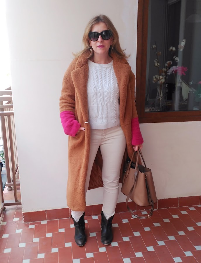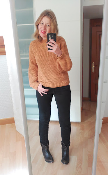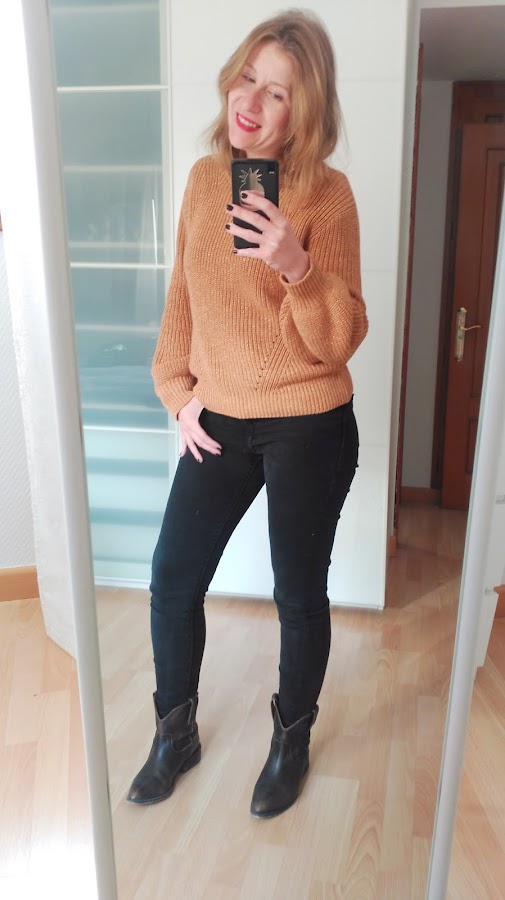 En este caso combino pantalones y jersey en este color, con complementos y abrigo marrón.