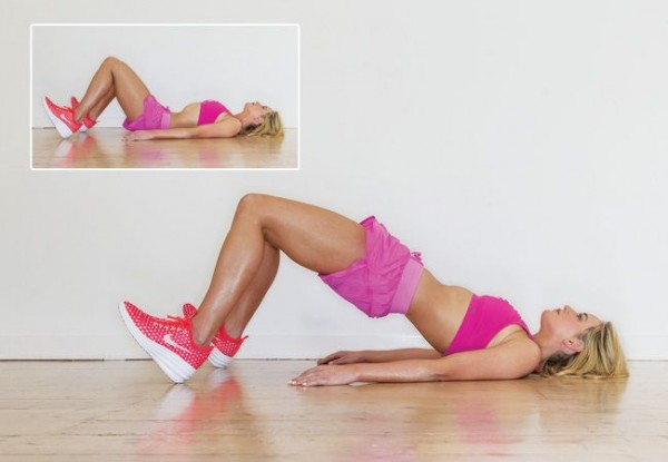 Acuéstate sobre una superficie dura. Flexiona tus piernas y levanta los glúteos, asegúrate de contraer el musculo una vez que estén arriba.