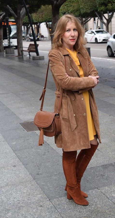 De nuevo color para combinar con el marrón, es este caso amarillo o mostaza en forma de vestido.