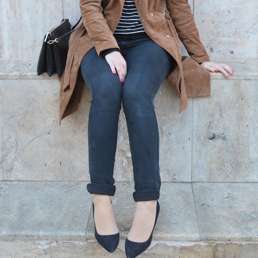 En este look quise combinar prendas negras con un aire marinero, por las rayas del jersey.