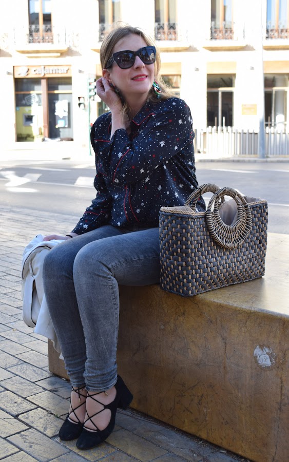 En el look de hoy, básicos sencillos de cualquier armario: unos vaqueros azules, una camisa, zapatos de tacón ancho y bolso grande.