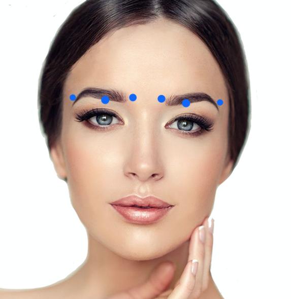 Hay 6 puntos en el área de las cejas que cuando se estimulan ayudan a reducir y a evitar las arrugas del área de los ojos y a tonificar la piel de esa zona.