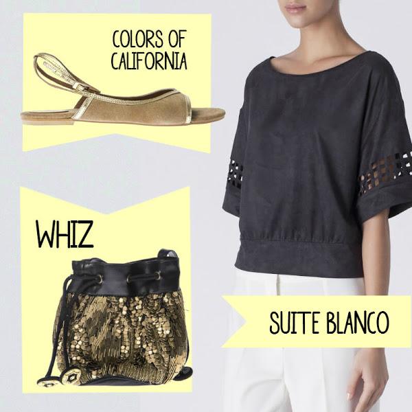 Esta bombonera en negro con cuentas y adornos dorados de Whiz para salir una noche de fiesta e ir preparada para todo. Pequeña, discreta pero muy elegante.