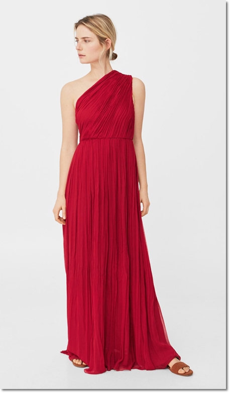 Vestido largo asimétrico de seda color geranio. Es un vestido muy bonito que luego puedes utilizar para las noches de verano con unas cuñas y un bolso de mimbre. Es de Mango (129,99 ).