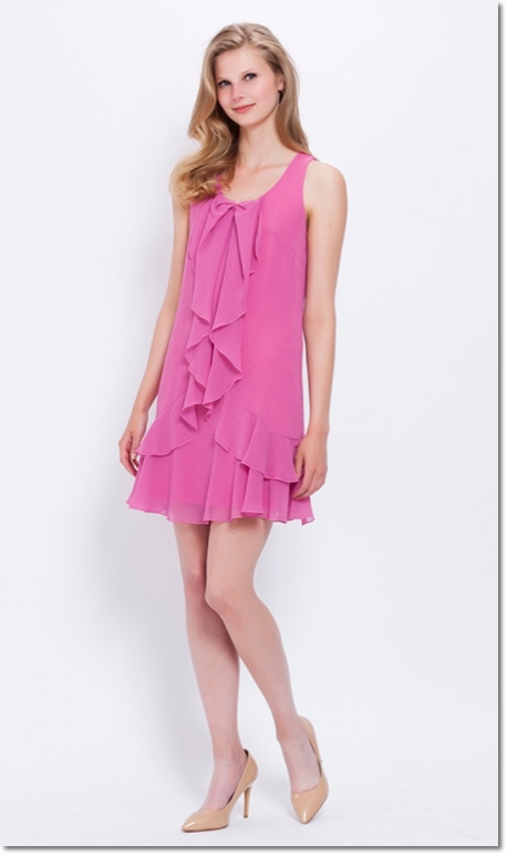 Vestido corto sin mangas con volante. De color buganvilla, este vestido es super cómodo para llevar durante varias horas y fácil de combinar para utilizarlo después. Este color favorece muchísimo. De Poète (129 ).