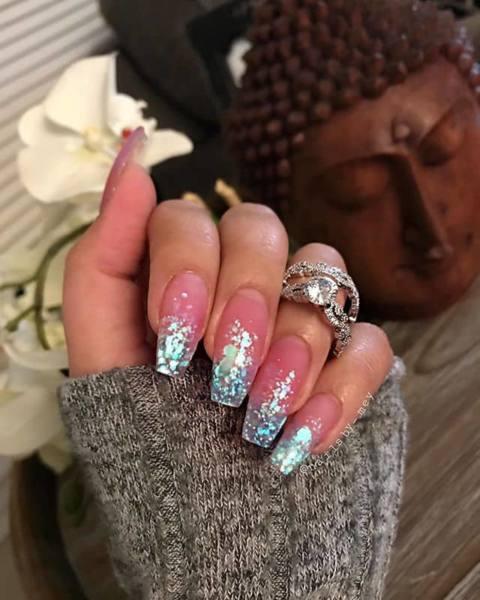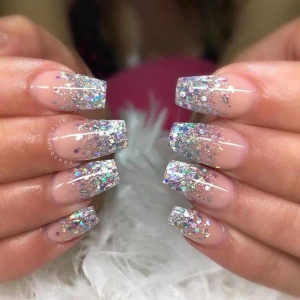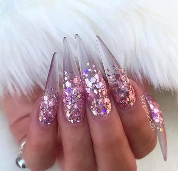 Si te gustan las uñas largas de aspecto único, entonces este es un gran look para ti. Estas uñas tienen un diseño casi cristalino que se asemeja a un carámbano. Las puntas de las uñas permanecen claras, pero el resto de la uña está recubierta de brillo grande y pequeño. Este brillo le dará a tus uñas un aspecto casi mágico que se ve muy bien.