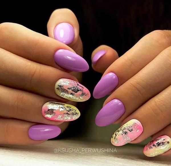 Las uñas en forma de almendra te dan muchas opciones de diseño, pero esta pintura púrpura pastel y las uñas de acento se ven increíbles en este diseño. Las uñas de acento son una suave mezcla de rosa y amarillo que está cubierto con un diseño de papel de aluminio que realmente salta sobre el suave color de las uñas. Uno o dos dedos de acento por mano será ideal.