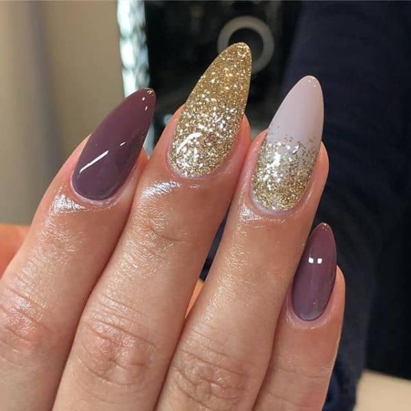 Este es el diseño de uñas largas perfecto para alguien que quiere crear un look elegante, pero a la vez misterioso y divertido. Los dedos principales son todos de color malva como el color que se muestra en esta imagen, pero hay dos dedos de acento en cada mano que están cubiertos de purpurina, lo que dice que es un poco más divertido.