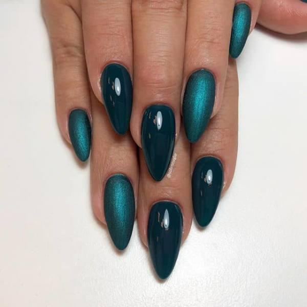 El arte de las uñas largas no siempre tiene que tener un patrón intrincado que sea difícil de crear. De hecho, esta idea sólo cambia ligeramente la coloración verde de las uñas. Algunas de las uñas tienen una capa superior brillante, mientras que otras tienen un color mate que se ve casi metálico a la luz.