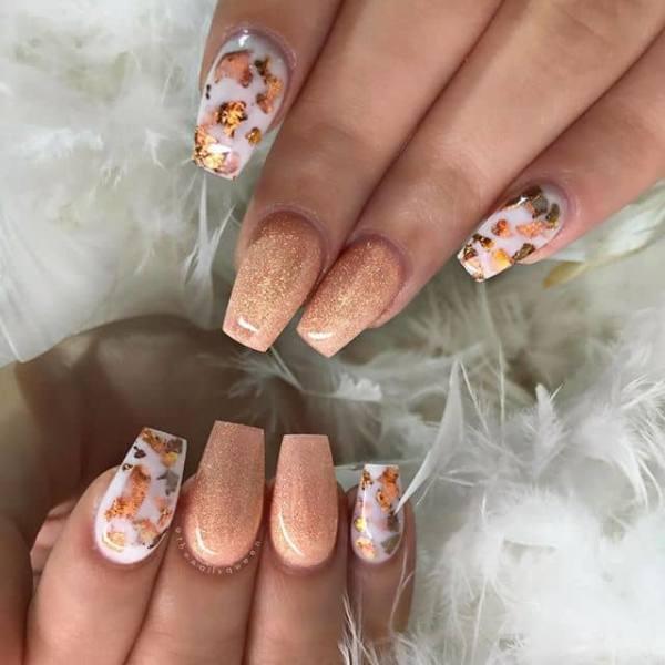 Este aspecto único tiene dos diseños de uñas diferentes que te encantarán. El primero es un esmalte color melocotón que está cubierto de un fino brillo, y el segundo es más bien un diseño de camuflaje que aparece cuando está junto a un color sólido. Estas uñas son de un blanco sólido con diseños naranja, marrón y amarillo.