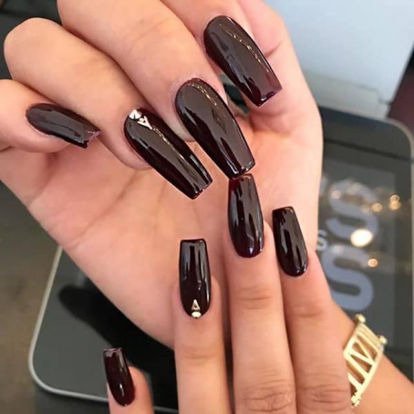 La siguiente idea es una gran opción para las uñas realmente largas. Las uñas serán de un color sólido que se ve casi negro con la luz adecuada, pero en realidad es más bien un color granate que se ve místico. Elige un dedo para acentuar, y luego coloca dos pequeñas gemas junto a tu cutícula y tal vez agrega una raya dorada en algunas uñas.