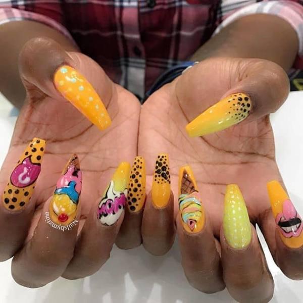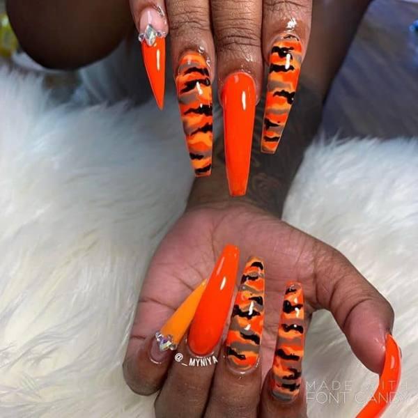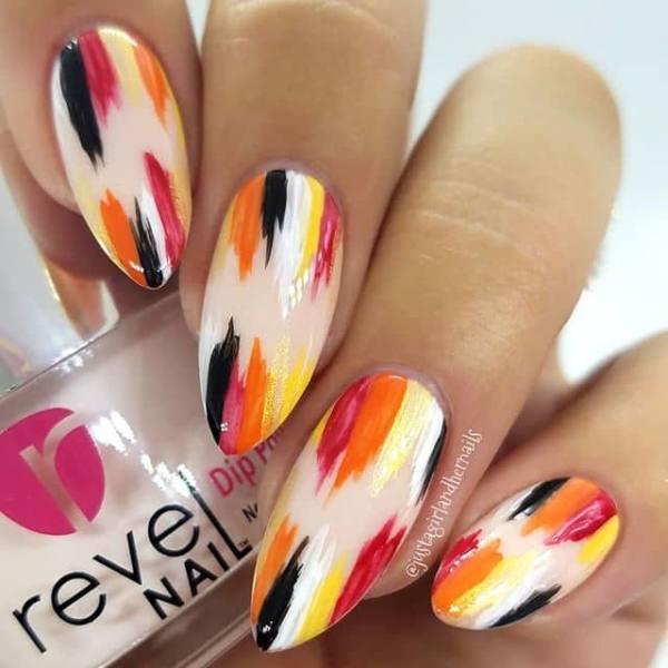 El próximo diseño que tenemos es uno que se verá mejor con las uñas largas. La capa base es de color naranja, pero puedes elegir cualquier tono brillante. Luego, usa pequeñas pinceladas para crear líneas desiguales y manchas de diferentes colores. Este diseño utiliza naranja, negro y rosa, pero puedes elegir cualquier color que combine con tu ropa.