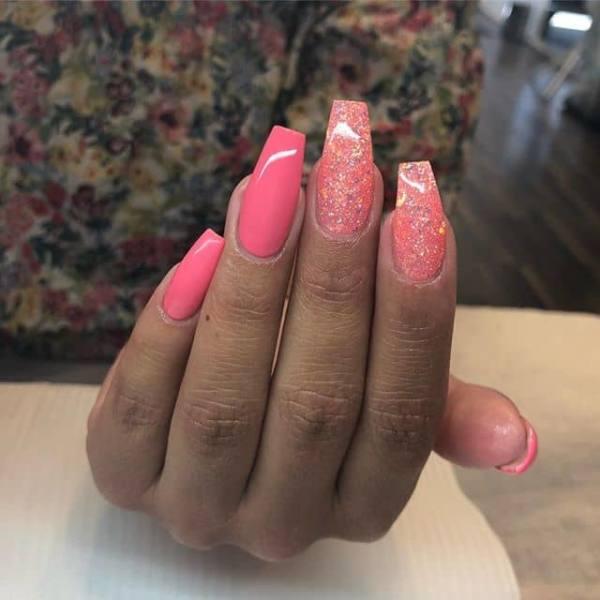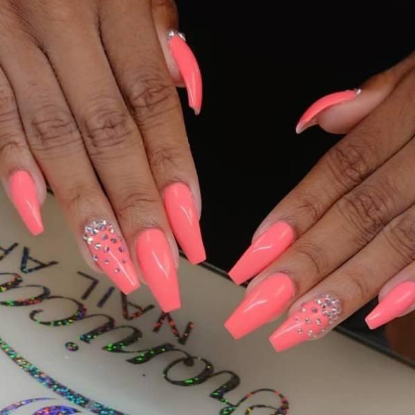 El rosa es uno de los colores más usados para los diseños de uñas, especialmente cuando tienes uñas largas en forma de coffin. Para hacer esta idea un poco más creativa, hay una uña de acento que está tachonada de gemas. Estas gemas se colocan de forma un tanto dispersa, de modo que el rosa se puede ver entre las gemas sin cubrir demasiado el diseño básico.
