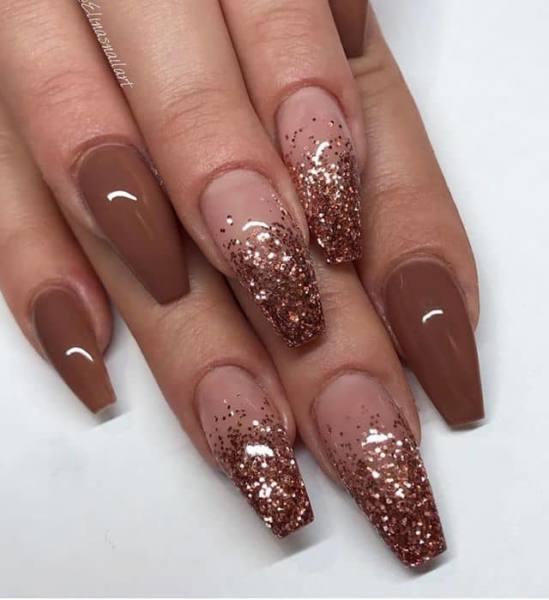 Este look combina un suave pulido marrón y brillo bronceado en un lindo look que te encantará. Las uñas de acento mantienen un aspecto natural, mientras que las puntas están cubiertas de brillo. Las otras uñas sólo tienen un color, pero todas están recubiertas con un esmalte transparente que crea un brillo que se verá muy bien con el vestuario de noche.