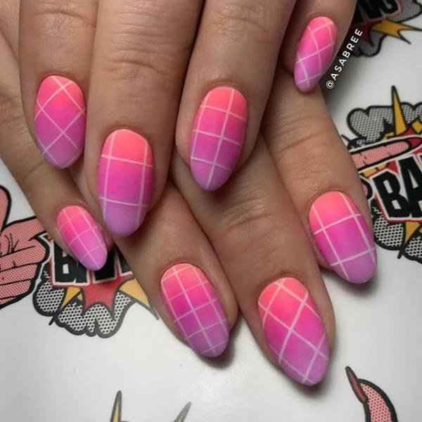 27. Diseño de uñas de color rosa y púrpura a cuadros