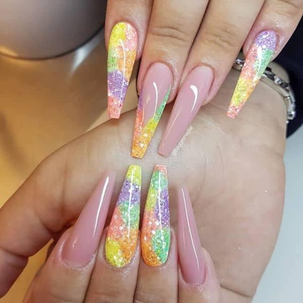 Si tienes las uñas largas, puedes recrear fácilmente este arte de las uñas. El esmalte base que vas a usar para este diseño es de un suave color rosa, y las uñas de acento están recubiertas de pasteles. Cada una tiene un arco iris de colores, que incluye naranja, amarillo, rojo, verde y púrpura que puede cubrir toda la uña o sólo las puntas.
