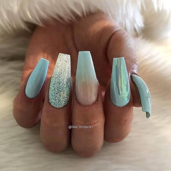 Si te gusta el azul, este es uno de los mejores diseños para uñas largas que encontrarás en esta galería. Cada dedo tiene un acento diferente, así que verás una uña con brillo, una uña con punta azul, una uña metálica y una uña azul más suave. Todas son de un tono similar, pero el aspecto de cada una varía un poco.