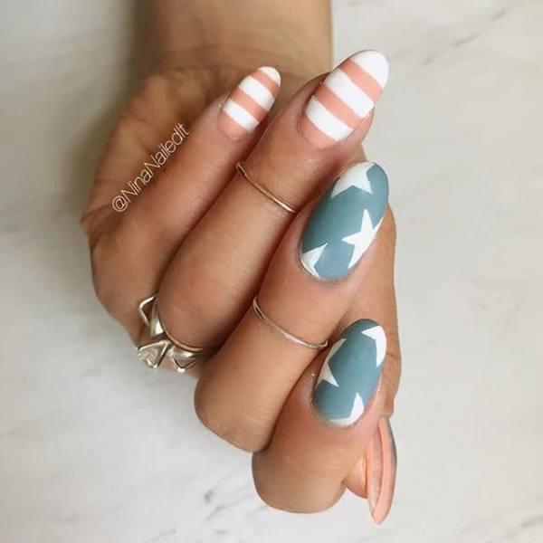 Si te sientes patriótico, entonces este diseño de uñas es uno que vale la pena probar. La mayoría de sus uñas serán pintadas de rojo, pero pinte dos dedos de acento de azul. Luego, crea rayas en las uñas que son rojas y estrellas en las que son azules para crear los colores de la bandera. El pulido sin brillo se verá mejor con este diseño.