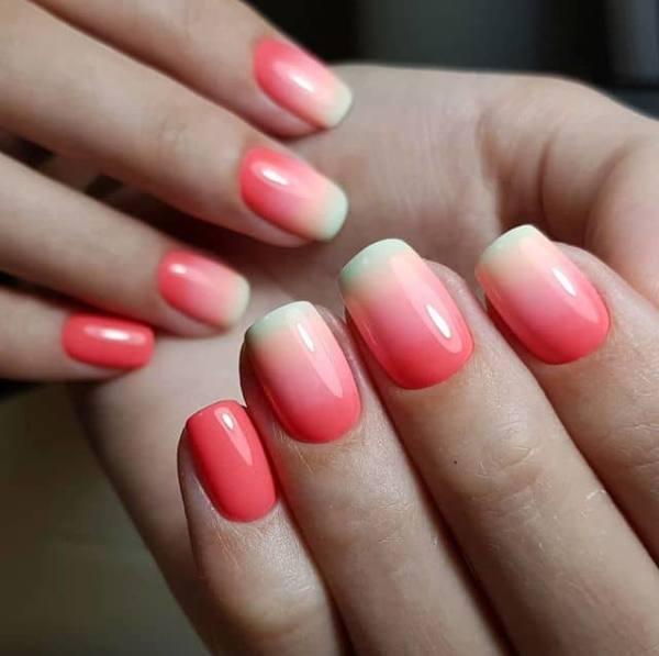 La siguiente idea de diseño es bastante linda, especialmente para aquellos que tienen las uñas algo cortas. Las uñas se pintan de rosa, y luego se cubren con esmalte blanco hasta que el rosa se desvanece en un color blanco en las puntas de las uñas. Si quieres, puedes dejar algunas de las uñas de color rosa sólido para que proporcionen un acento fresco.