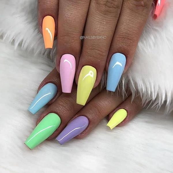 Este próximo diseño añadirá un toque de color a tu vida. Cada uña es de un color diferente, pero todas son de color pastel sólido en ambas manos. En esta imagen de la galería, verás uñas rojas, rosadas, naranjas, amarillas, azules, verdes y moradas, pero puedes elegir qué uñas son de qué color cuando recrees este arte de uñas largas.