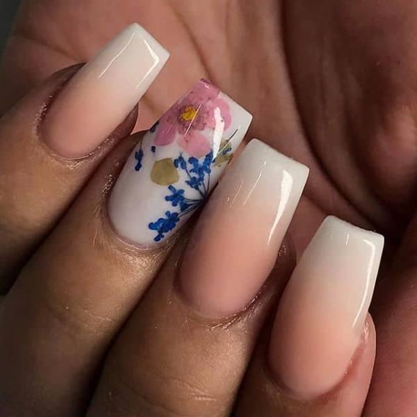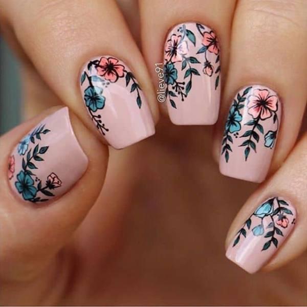 35. Uñas de color rosa suave con hermosos diseños de flores