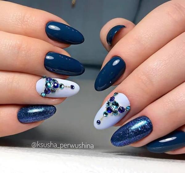 Estas uñas almendradas se ven muy bien con el esmalte de uñas azul, especialmente las uñas que se acentúan para resaltar y llamar la atención. Una de las uñas de acento es simplemente brillante que brilla con la luz en el ángulo correcto, pero la otra tiene un intrincado patrón de gemas que hace que tu uña parezca que lleva un collar de zafiros.