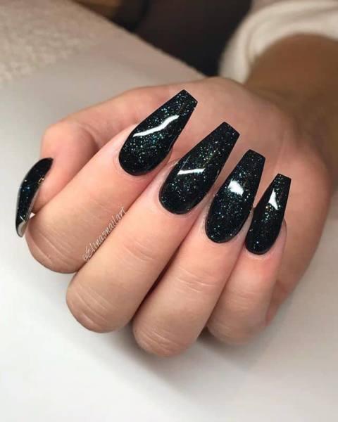 Este es un diseño de uñas único que se asemeja a las estrellas del cosmos cuando miras al cielo desde la Tierra. El color base de este diseño es negro, pero hay una única capa de pequeño brillo que parece una estrella lejana. El diseño se recubre con un esmalte transparente que añade brillo a las uñas y las hace resaltar.