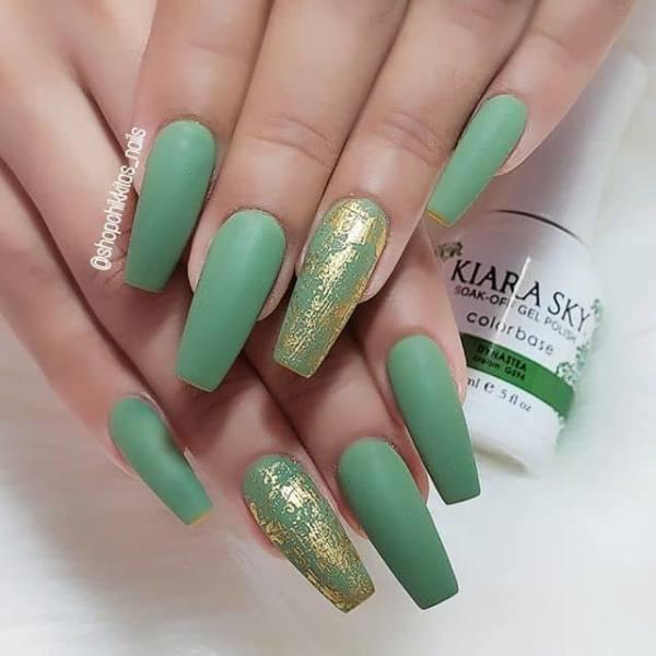 A veces los diseños de uñas largas y simples son los que más nos interesan. Esta idea es una que utiliza un tono de verde inusual como base, pero es un color suave que se verá bien con su uso diario. El dedo anular está acentuado con un diseño de plantilla de oro que nunca saldrá exactamente igual dos veces.