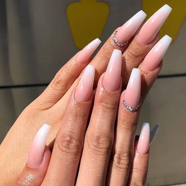Este próximo diseño de uñas largas es uno que se destaca no sólo porque se ve mejor en las uñas más largas, sino porque el esmalte es de color rosa vivo. A medida que te alejas de la cutícula hacia las puntas, la uña se desvanece del rosa al blanco. Si prefieres un color más suave, el mismo diseño puede ser creado con un color diferente de esmalte.