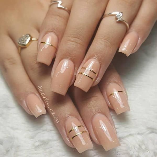 Este es otro diseño simple que no requiere mucho esfuerzo para crear. Las uñas son de un color suave, pero si miras el dedo índice, notarás un solo anillo de oro que está diseñado como acento para esta idea, y hay dos anillos en el dedo anular para añadir aún más elegancia al estilo.