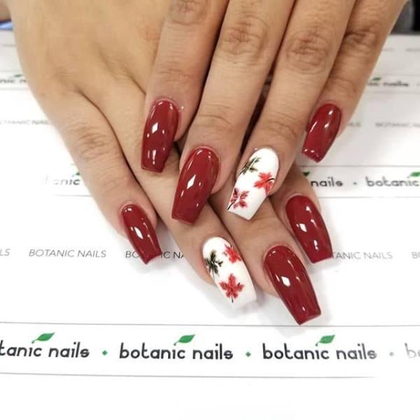 Si te gusta el esmalte de uñas rojo, prueba la siguiente opción de diseño para uñas largas. La mayoría de las uñas están pintadas de un hermoso tono rojo, pero los dedos que están acentuados son blancos, lo que contrasta completamente el aspecto. Las hojas están pintadas en la superficie blanca para crear un diseño interesante que llame la atención.