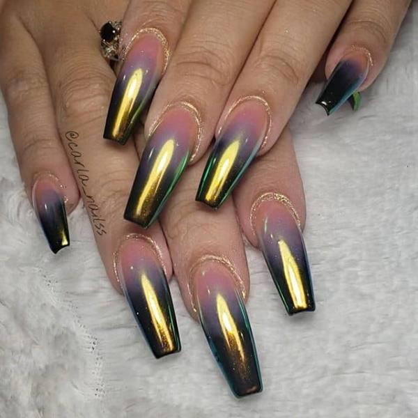 No todos los diseños de uñas largas tienen que ser sutiles, y esta siguiente idea es una que rompe todas las expectativas cuando se trata de uñas tradicionales. La uña es de un rosa suave cerca de la cutícula, pero a medida que te mueves hacia la punta de la uña, cambia. Primero, es un tono púrpura; luego, se convierte en un color dorado metálico.