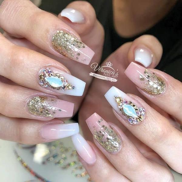 El próximo diseño no es fácil de manejar, pero funcionará mejor en uñas largas. Las uñas en sí son de un rosa suave. Algunas tienen puntas blancas, pero la mayoría del acento en este diseño proviene de los brillos y gemas que se colocan en la uña para crear un aspecto único. Las gemas son ideales para el dedo corazón.