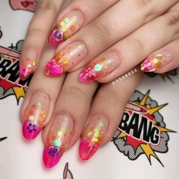 Las uñas largas se ven muy bien con diseños de punta porque tienen más espacio para diseños intrincados. Esta idea es una que tiene un aspecto natural en la cutícula, pero las puntas son de color rosa con patrones florales y diseños que realmente se destacan. Cada uña tiene un diseño diferente, pero todas se ven lindas y atrevidas. También hay piezas de confeti de oro en las uñas.