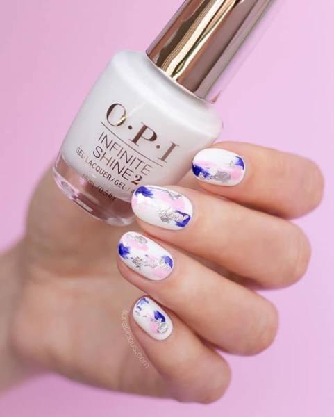 Para crear este aspecto, tendrás que pintarte las uñas de blanco. Asegúrate de usar unas cuantas capas para que el blanco sea lo suficientemente opaco como para que no puedas ver la uña que estás pintando. Luego, elige dos uñas para acentuar cada mano, y pinta una sola capa de brillo de uña de gel en forma de estrella en esas uñas.
