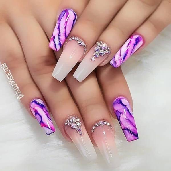 Los acentos de gemas lindas se ven muy bien en las uñas largas, y este arte de uñas combina una uña natural con algunos acentos coloridos. Comienza cubriendo tus uñas con un suave esmalte rosa, luego escoge dos para tachonarlas con gemas en un diseño simple pero elegante. Las otras uñas tendrán un remolino púrpura sobre el esmalte rosa para crear un efecto de teñido.