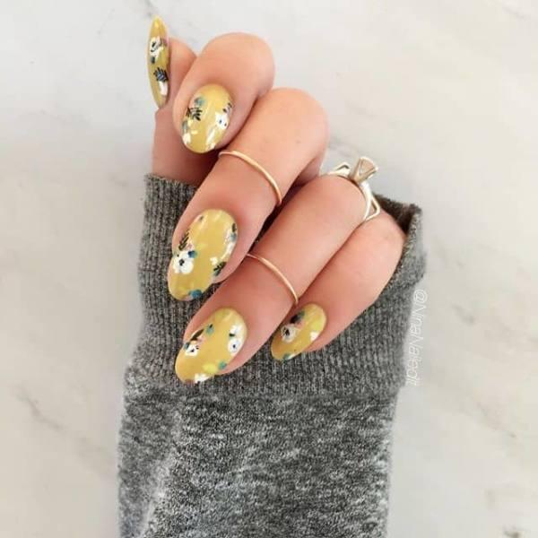 Esta idea de las uñas es realmente un diseño fácil de recrear. Empieza cubriendo tus uñas con un color amarillo. Asegúrate de que sea lo suficientemente grueso para que tus uñas no se vean a través de la pintura. Luego, agrega algunas flores pequeñas a la derecha e izquierda de tus uñas. Las flores no necesitan verse perfectas para que se vean bien en las uñas largas.