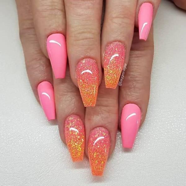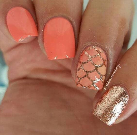 Un color brillante, un poco de brillo y una uña con acento creativo es igual a una perfecta trifecta de primavera. Estas uñas tienen dos adorables uñas anaranjadas, un mega-rosado dorado, y luego el perfecto matrimonio de las dos en un patrón de sirena en el medio. Usar estos colores y estilos juntos funciona para casi cualquier ocasión y pueden ser fácilmente vestidas de arriba a abajo.