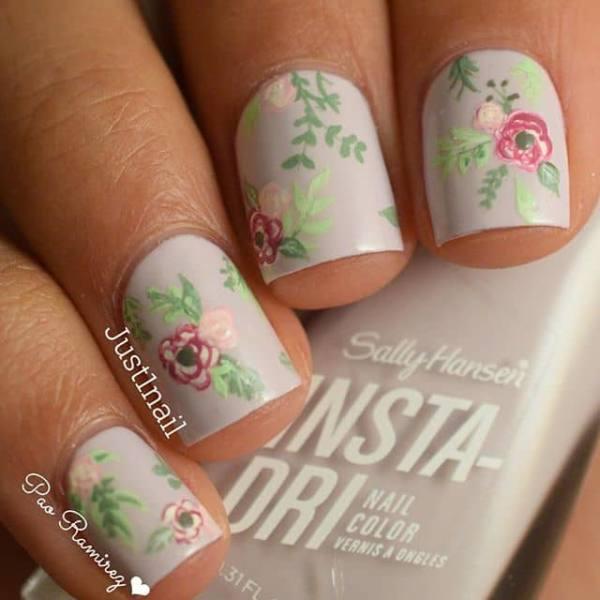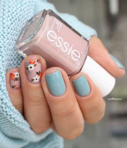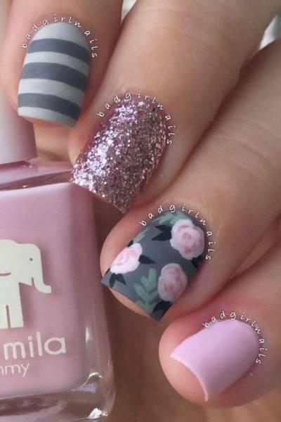 Si tienes una boda en primavera a la que asistir, esta es una buena elección. Con suficiente glamour y romance estas uñas lo tienen todo. Combina el color mate con tu vestido, y tendrás un look que evoca la fiesta, con la uña brillante, y el romance vintage con las dos simples uñas florales.
