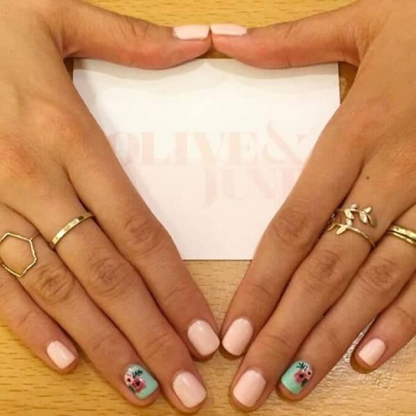 Si tienes algo de tiempo para dedicarle al arte del diseño de uñas, esta es una gran pieza para empezar. Con una sola uña de acento en cada mano, el sutil rosa funciona perfectamente para realzar, no distraer, la belleza de la uña de acento floral. Tómate tu tiempo y practica para que las flores queden bien.