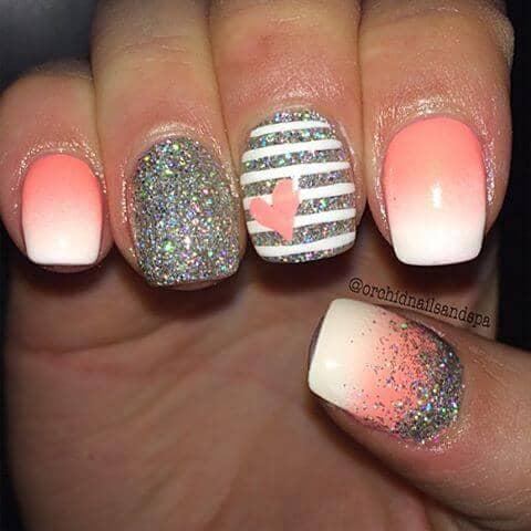 Estas uñas son una mezcla fantástica de estilos y tendencias que juntas crean un look primaveral perfecto para tu próximo evento. El uso de dos uñas ombre lisas equilibra perfectamente el destello de los brillos que aparecen en las otras uñas. Por supuesto, la uña con acento destacado presenta destellos, rayas y un adorable corazón de color a juego.