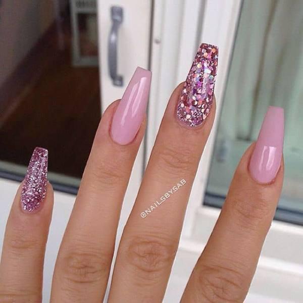 ¿Quién no ama un poco de rosa en su vida? Estas uñas son un gran estímulo para dejar los días oscuros del invierno y levantarán el ánimo de todos los que conozcas. Las uñas de afuera se mantienen simples con tu tono rosado favorito, y las del medio saltan y brillan con algunos brillos.
