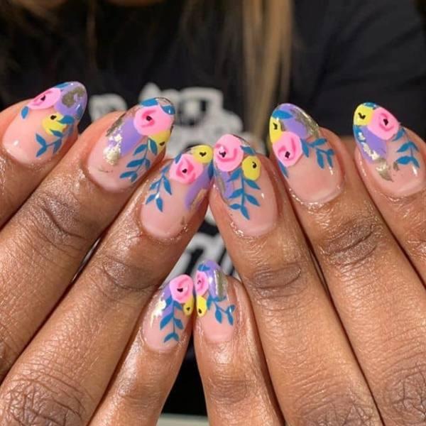 Estas flores pintadas a mano y el verdor tienen una sensación casi victoriana con sus rosas de polvo y su base púrpura mate. Este diseño de uñas es perfecto para cualquier ocasión primaveral y puede ser usado fácilmente en la oficina, en la hora feliz, en la boda, en el brunch… ¡donde sea! Asegúrate de encontrar una mano firme para pintar estas pequeñas flores.