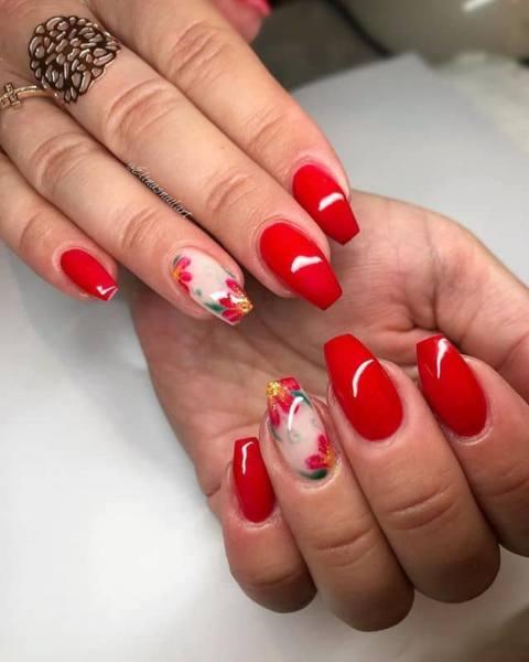 Las uñas de color rojo brillante siempre están dentro, pero hay algo especial en ellas cuando llega la primavera. Tienen una forma de estimular a quien las lleva y dar una sensación de fuerza. Suaviza este poderoso tono con una sola uña de acento delicado con flores primaverales brillantes para una mezcla perfecta de romance y fuerza.