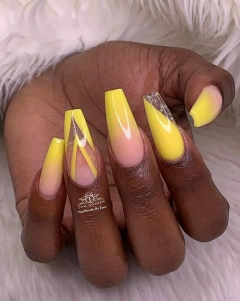 Este brillante y súper elegante diseño logra ese difícil equilibrio de variedad y cohesión. El pulgar, el medio y el meñique ostentan un hermoso ombre amarillo a rosa que recuerda a una puesta de sol en California, mientras que el puntero y el anillo añaden diseños geométricos para dar un poco más de interés visual. Es moderno y hermoso a la vez.