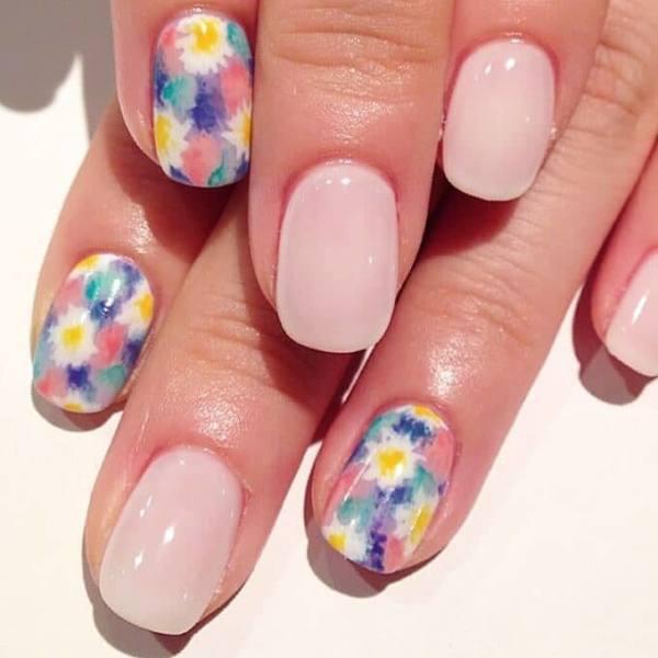 p>Este color rosa casi desnudo es una gran elección cuando tienes un diseño súper genial que quieres que brille. Las uñas de acento en estos dedos tienen un aspecto suave y colorido de acuarela que es muy único y artístico. No verás muchos diseños de uñas como esta belleza.