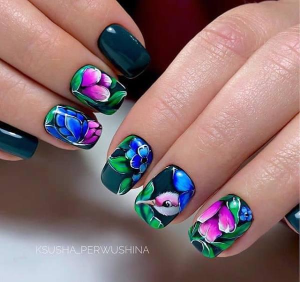 Pintado a mano sobre uñas naturales, este diseño es una intrincada obra maestra. Abarcando múltiples uñas para crear una escena de jardín, representan a un dulce colibrí visitando las flores frescas de primavera. El fondo oscuro realmente hace que los colores resalten, y tener unas pocas uñas en blanco da un enfoque decidido a la mirada.
