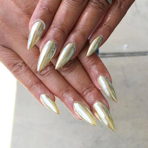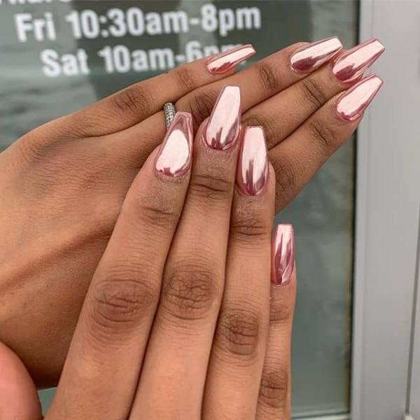 Cuando el sol empieza a brillar es hora de sacar sus favoritos metálicos. Estas uñas brillantes se ven muy bien en un día cálido de primavera cuando pueden atrapar la luz justo para brillar como joyas para sus uñas. Elija este look cuando se dirija a una gran fiesta de primavera o a una celebración de boda.