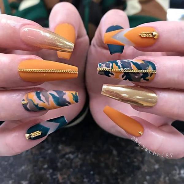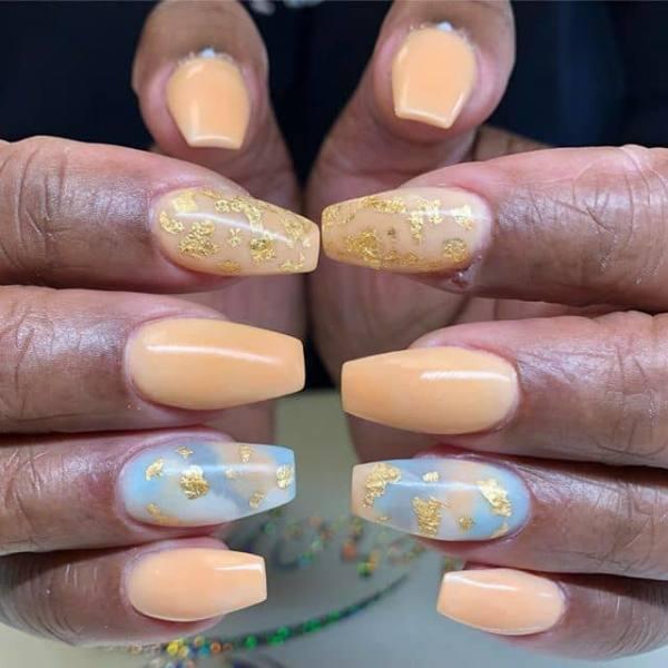 Un color de uñas anaranjado melocotón es genial para el otoño y también combina muy bien con una fabulosa lámina de oro. Añade un poco de brillo con unas pocas manchas aquí y allá y, si quieres, pon una uña de acento con las mismas manchas doradas para un poco más de variedad.
